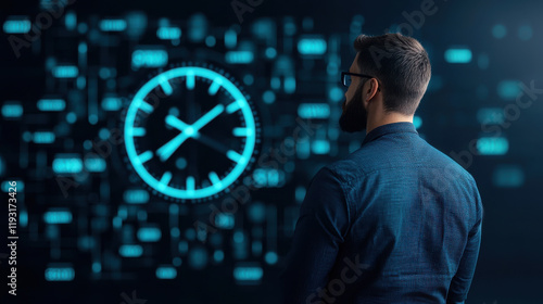 man with glasses stands in front of glowing digital clock, contemplating time and technology. futuristic background enhances atmosphere of innovation and progress