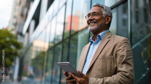 Man with gray hair and a beard is smiling and looking off into the distance while holding a tablet, standing in front of a modern glass building.