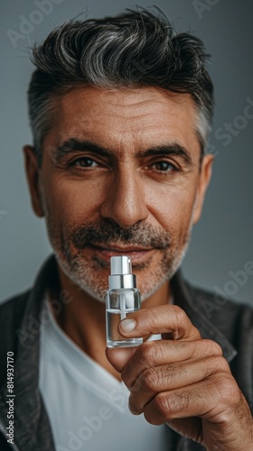 Man with graying hair and beard holding a small bottle of perfume looking directly at the camera with a slight smile.