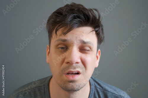 Man with hangover waking up sitting in bed feeling terrible headache looking at camera. Drug and alcoholism addiction, human bad habits. Morning after a great party.