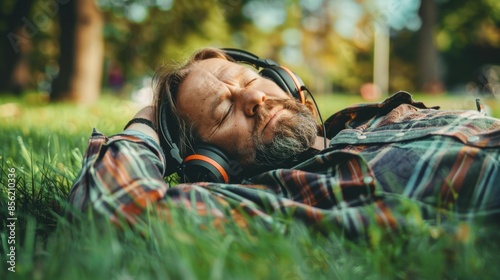 Man with headphones lying in grass eyes closed