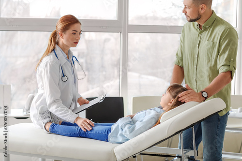 Man with his little daughter visiting gastroenterologist in clinic