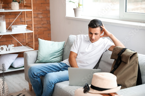 Man with laptop booking tickets online at home