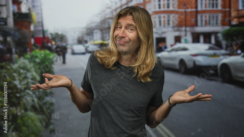 Man with long blond hair shrugs shoulders on a bustling urban street lined with red brick buildings; uncertainty.