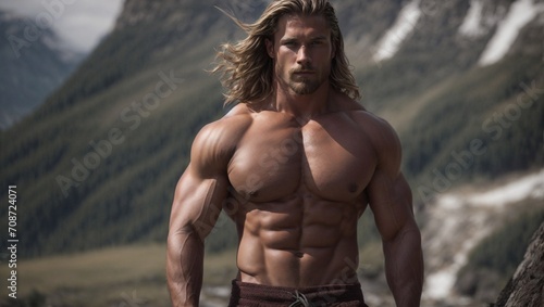 Man With Long Hair Walking Shirtless on Trail. Generative AI.