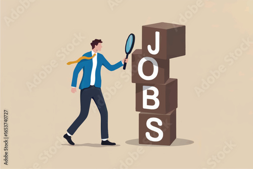 Man with magnifying glass examining stacked blocks spelling out jobs isolated on transparent background