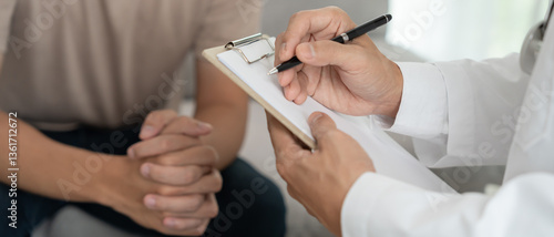 man with mental health problems is consulting. psychiatrist is recording the patient's condition for treatment. encouragement, love and family problem, bipolar , depression patient, protect suicide