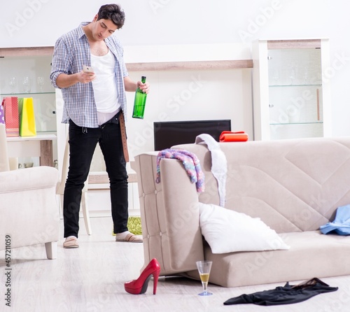 Man with mess at home after house party