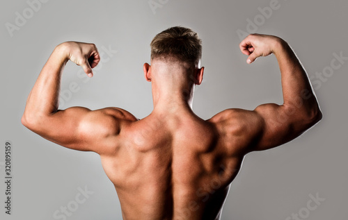 Man with muscular arms, triceps. Waist, waistline. Guy with beautiful torso. Muscular back, muscular man, muscled back, naked torso. Male naked, healthy musculars guy, torso man, isolated