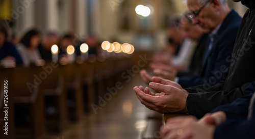 Man with open hands praying during a religious service in a church. Christian worship and spiritual devotion concept.