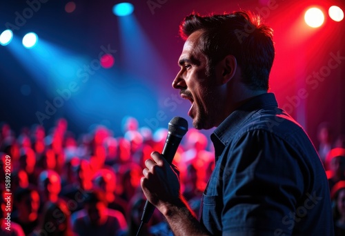Man with short dark hair and beard sings passionately into microphone on stage with colorful lights and audience in background