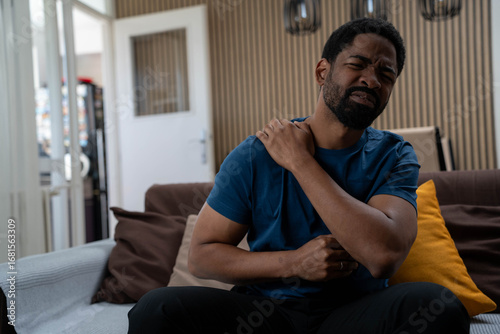 Man with shoulder pain sitting on sofa at home, adult male suffering from injury or muscle problem with painful expression.