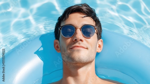 Man with sunglasses relaxes on inflatable ring in pool, enjoying summer sun, peaceful expression.