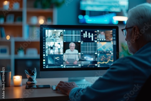 Man working from home office with multiple screens displaying data analysis and video conferencing, evening setting with cozy atmosphere.