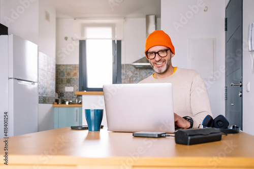 Man working from home on a laptop computer sitting at a desk surfing the internet