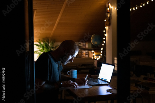 Man working late with laptop and papers