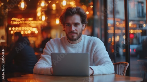 Man working on a laptop in a cozy cafe with bokeh lights. Represents remote work, modern lifestyle, creativity, and productivity in a warm and inspiring atmosphere