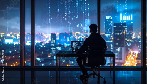 Man working on a laptop in a modern office, analyzing futuristic digital data streams over a glowing city skyline at night