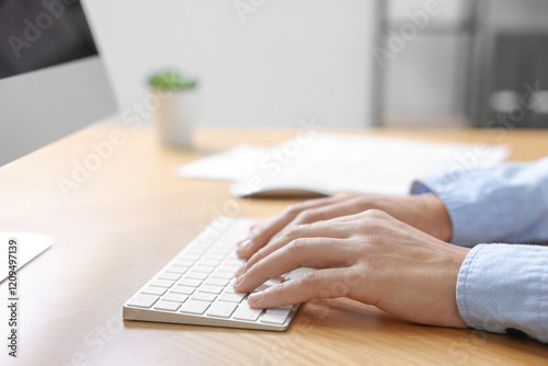 Man working on computer at wooden desk in office, closeup