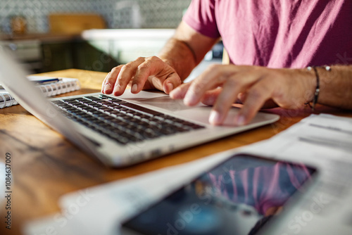 Man working on laptop at kitchen table