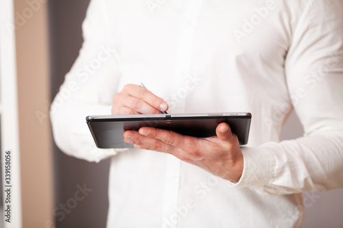 Man working on tablet at company office.
