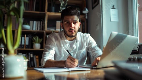 Man working with focus in an office with plants.