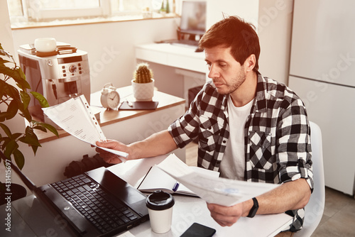 Man works at home office with laptop and documents