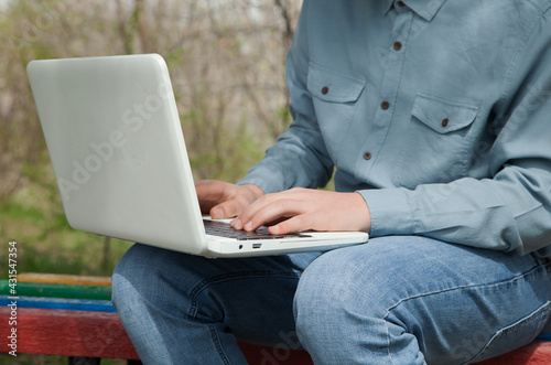 Man works outdoors with a computer.
