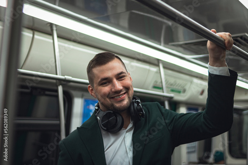 man young male caucasian passenger one person positively cheerful listens to music in headphones, smiles and go by subway transport in the morning. concept subscription to music.