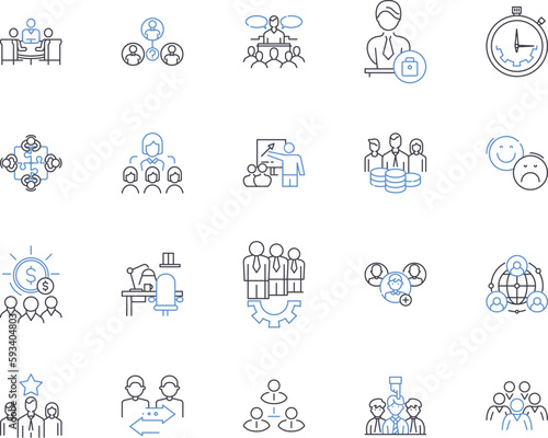 Management coworkers outline icons collection. Cooperation, Collaboration, Teamwork, Relationships, Motivation, Communication, Efficiency vector and illustration concept set. Productivity, Respect