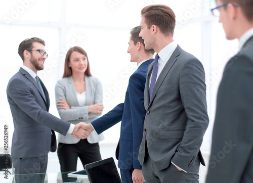 Manager looks at the handshake of business partners