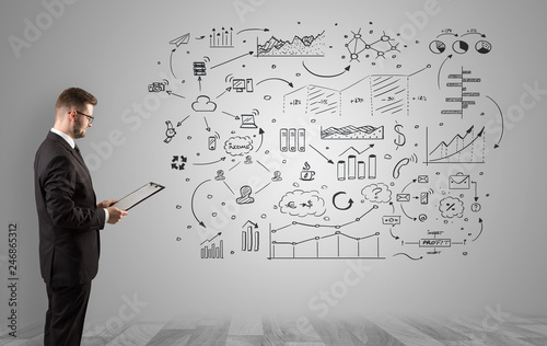Manager staying and presenting office affairs for someone with graphs, icons reports around