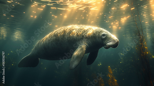 Manatee swimming in clear underwater sea, sunlight shining on aquatic marine animal in ocean