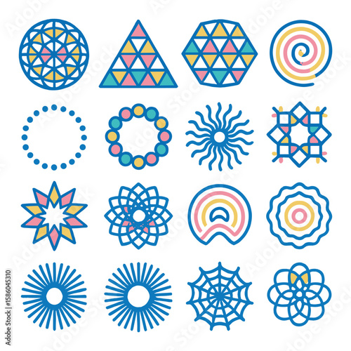 Mandala Geometric Patterns modern flat style . circle grid mandala, triangle mandala, hexagon mandala, spiral mandala, dot ring mandala, bead circle mandala, wave mandala