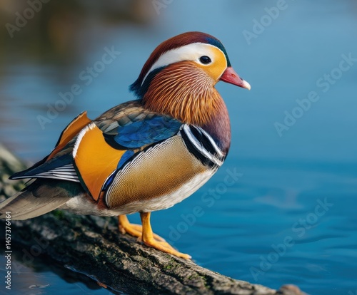 Mandarin duck, Aix galericulata. Bird near river water.