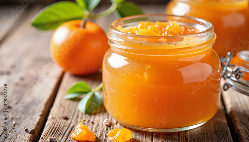 Mandarin jam close-up in rustic setting, a sweet indulgence