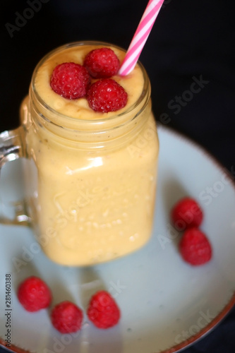Mango and banana smoothie decorated with raspberries and reusable straw. Selective focus.