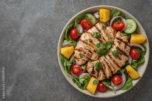 Mango and grilled chicken salad featuring cilantro, cucumbers, cherry tomatoes, and red onion on a neutral backdrop, overhead shot with space for text