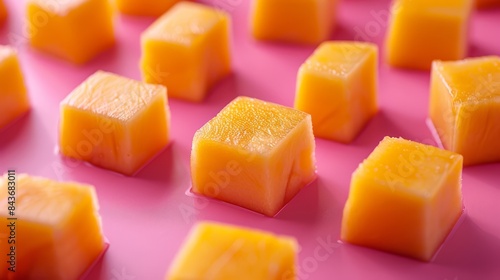Mango cubes on a hot pink background, strong lighting, tropical and refreshing,