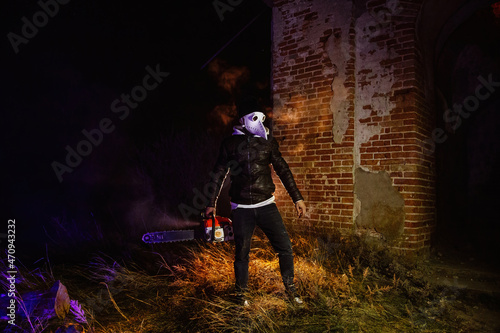Maniac in mask of plague doctor with chainsaw