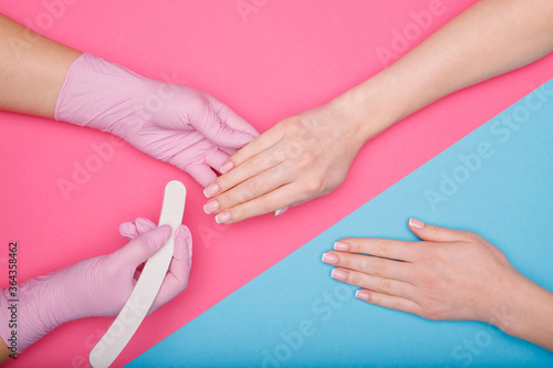Manicurist doing professional manicure. Master files nails to client on pink and blue background. Top view. Beautiful female hands with stylish nail manicure gel polish.
