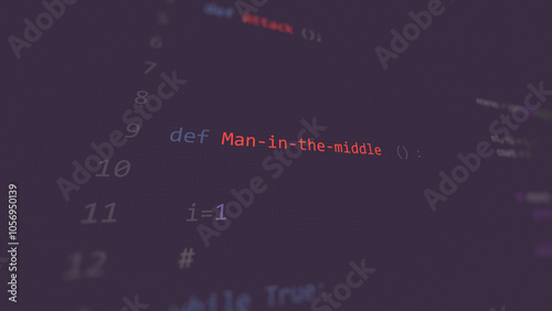 Man-in-the-middle text in foreground screen. Man in the middle vulnerability text in informatic system style, code on editor screen. English language.