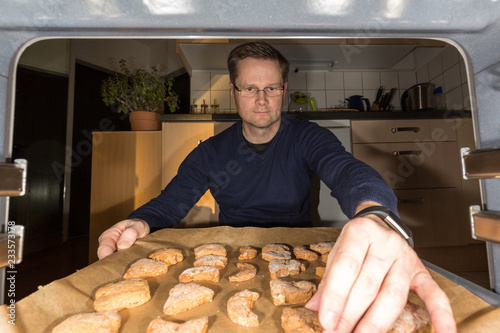 Mann reiht Kekse auf dem Backblech auf und schiebt das Backblech in den Backofen