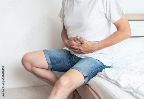 Mann über 40 sitzt mit Bauchschmerzen auf einem Bett im Schlafzimmer. Teilabschnitt, Hände, Jeanshose, weißes T-Shirt, Krankheit.