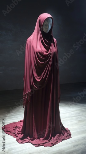 Mannequin in a dress sits on the floor. Muslim woman in hijab. Mannequin in dress and hijab. Modesty. Religion Islam. The room is dark.