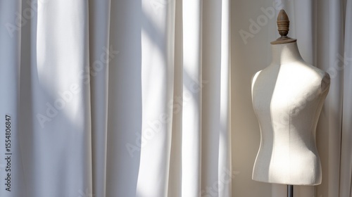 Mannequin stands near white fabric with sunlight creating shadows in an interior space.
