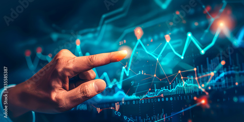 Mano apuntando una pantalla 3d de una gráfica económica estilo de negocios y tecnología