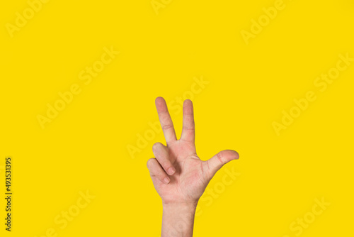 Mano de hombre con la palma abierta, gesticulando el número tres sobre un fondo amarillo liso y aislado. Vista de frente y de cerca. Copy space