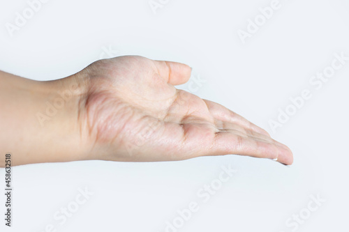 MANO FEMENINA EXTENDIDA MOSTRANDO ALGO SOBRE FONDO BLANCO