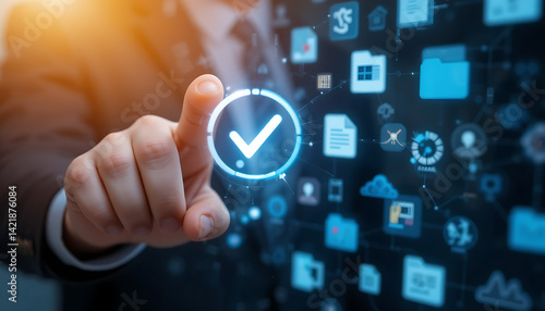 Man’s finger interacting with a holographic check mark, with floating digital files and documents in the background. Blank space available